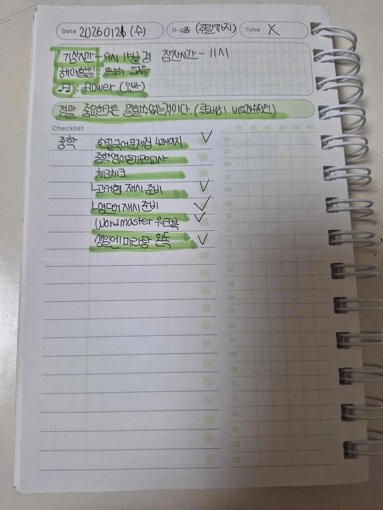 첫째가 스케쥴 노트에 오늘 해야할 일과 명언, 하고싶은 일들을 공을 들이면서 쓰고 자기가 오늘 한일에 대해 형광펜으로 체크를 하고 있다. 월, 수, 금 오전 10시에 수학학원에 가서 중학교 1-1학기 수학을 배우고 숙제까지도 마무리를 다하고 온다. 첫째가 수학학원에서 공부하고 오후 12시 30분, 늦어지면 1시쯤에 집에 온다. 아이들과 점심을 먹고 나서 첫째는 스스로 책을 좋아하고 독서습관이 잘 형성되어 있어 책을 읽는 시간이 금새 2시간이 넘어간다.