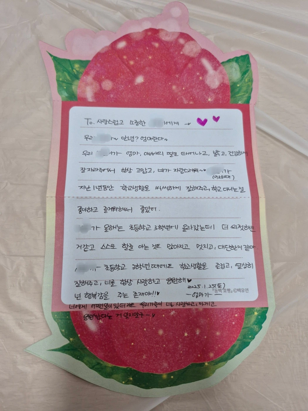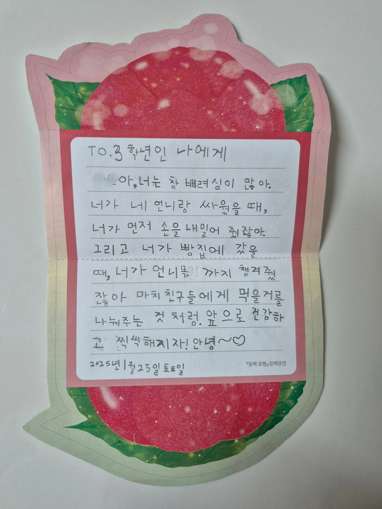 아이와 부모에게 동백호빵 편지지를 각각 1장씩 주셔서 아이는 자기 자신에게, 난 둘째에게 정성을 담아 꾹꾹 눌러쓴 편지를 작성했다. 아이들에게 종종 편지나 쪽지를 써서 주는데 이번 행사는 둘째에게 집중해서 함께 시간을 보내고 아이에게 고마운 마음과 사랑을 담아 써주니 아이가 감동받았다고 했다. 아이가 자기 자신에게 쓴 편지를 보니 아이가 쓴 내용이 풍성하고 다양하게 표현해서 감사하고 노력한 부분에 대해 칭찬을 해주었다.