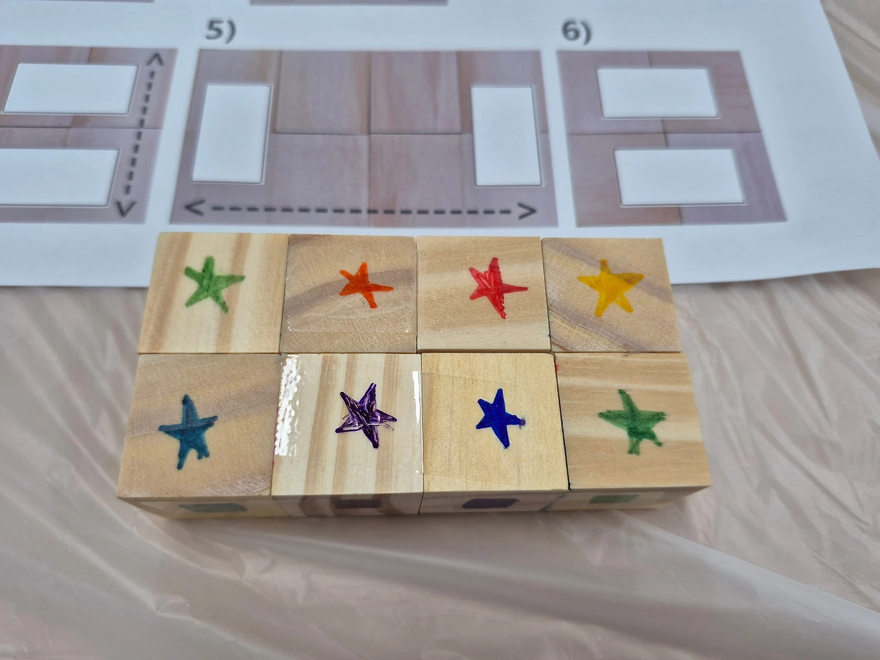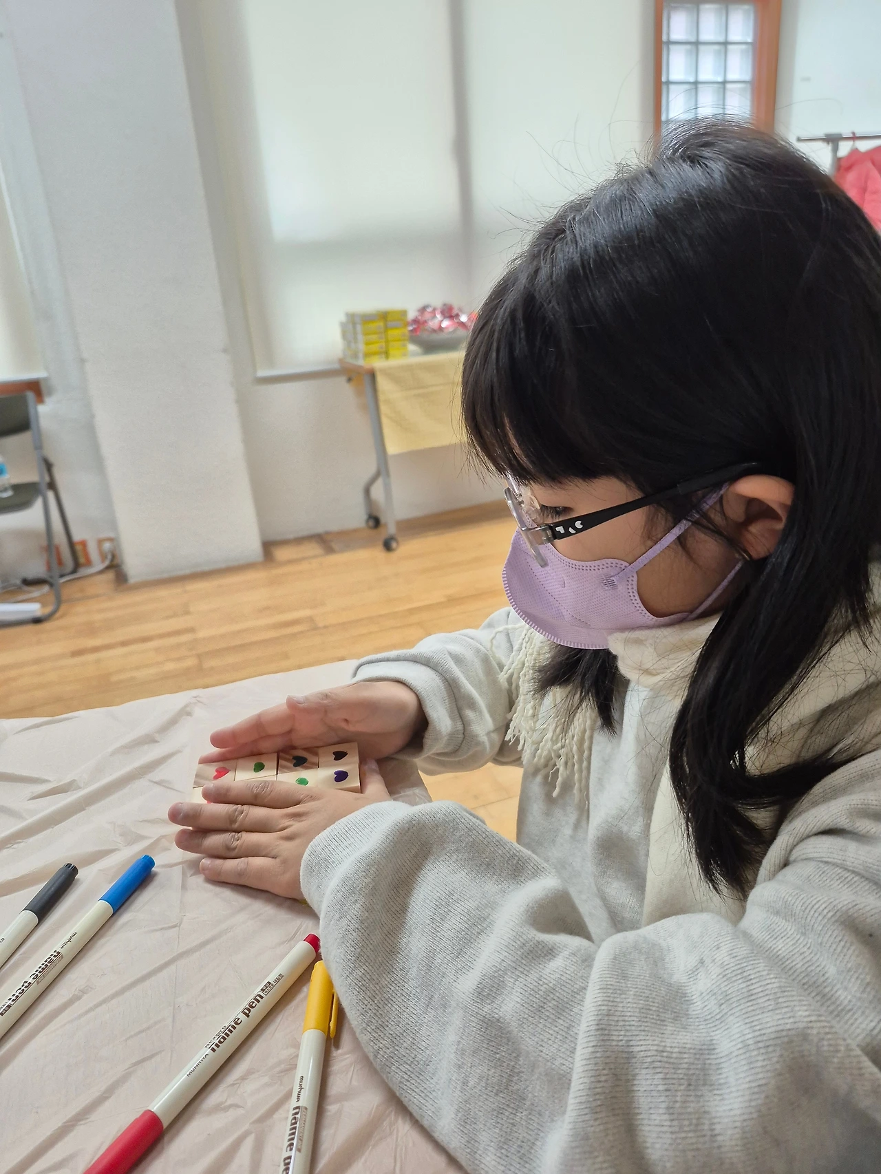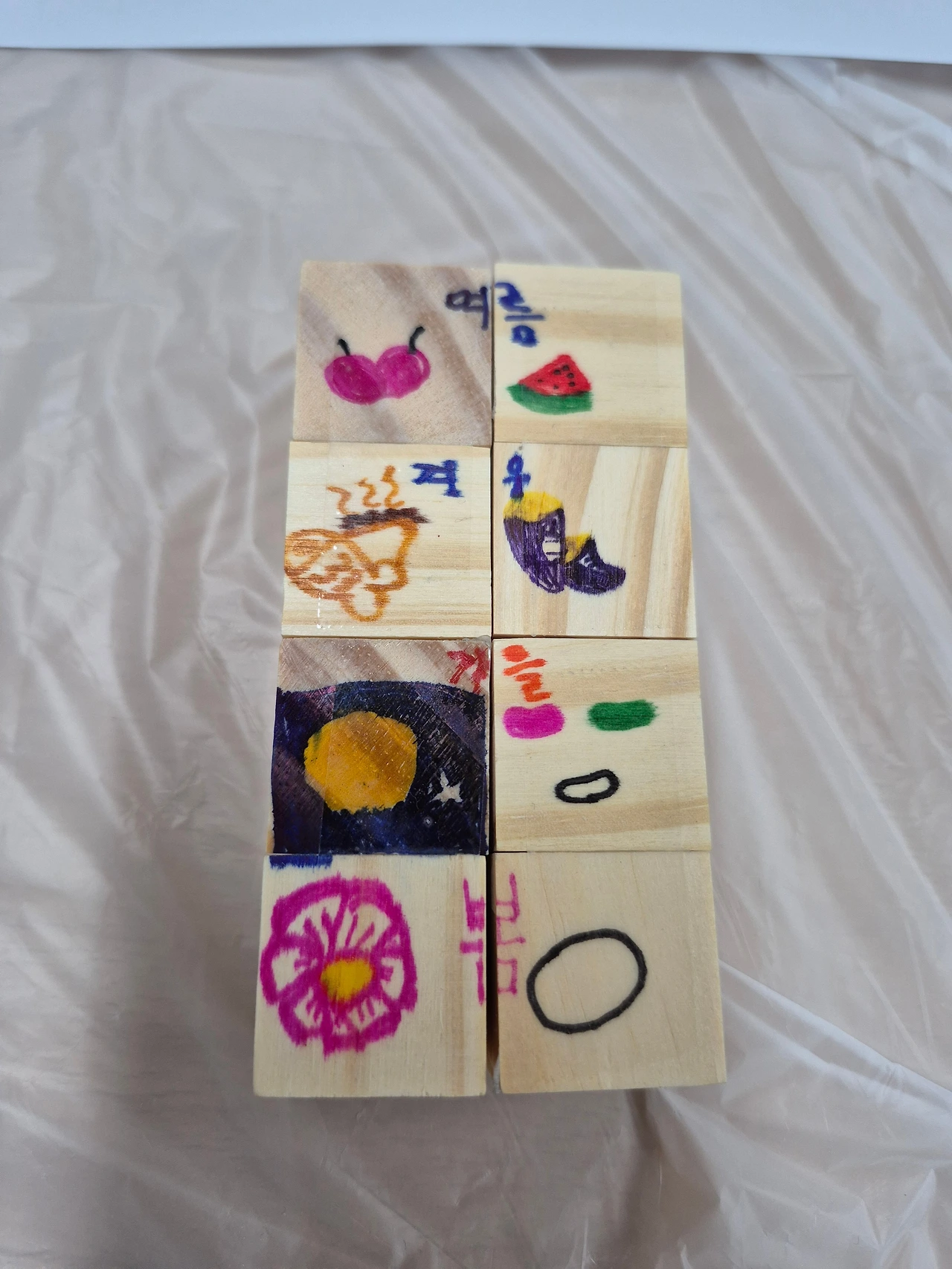 먼저 도서관 사서 선생님이 진행하시는 그림책 큐브부터 진행되어 나무도막에 그림을 그리고 색칠하고 테이프로 붙여서 큐브로 만들어내는 작업이었다. 아이가 좋아하는 봄, 여름, 가을, 겨울 4계절부터 겨울에 즐겨 먹는 군고구마, 붕어빵, 호빵 등 간식, 하트, 별모양, 네모모양으로 그림 그리고 알록달록 색칠하고 꾸미는 노력을 했다.