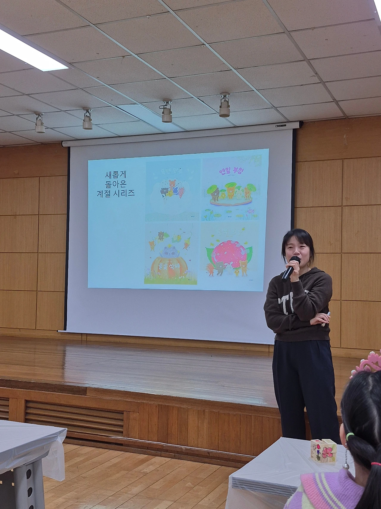 백유연 작가와의 만남이 있는 날, 아이와 함께 설레고 들뜨는 마음으로 도서관으로 향했다. 아이의 두 손에는 벚꽃팝콘과 목련만두 그림책도 말이다. 도서관 3층과 연결된 주민센터 다목적실에 가서 참석자 출석체크를 하고 아이와 함께 원하는 자리에 앉았다.