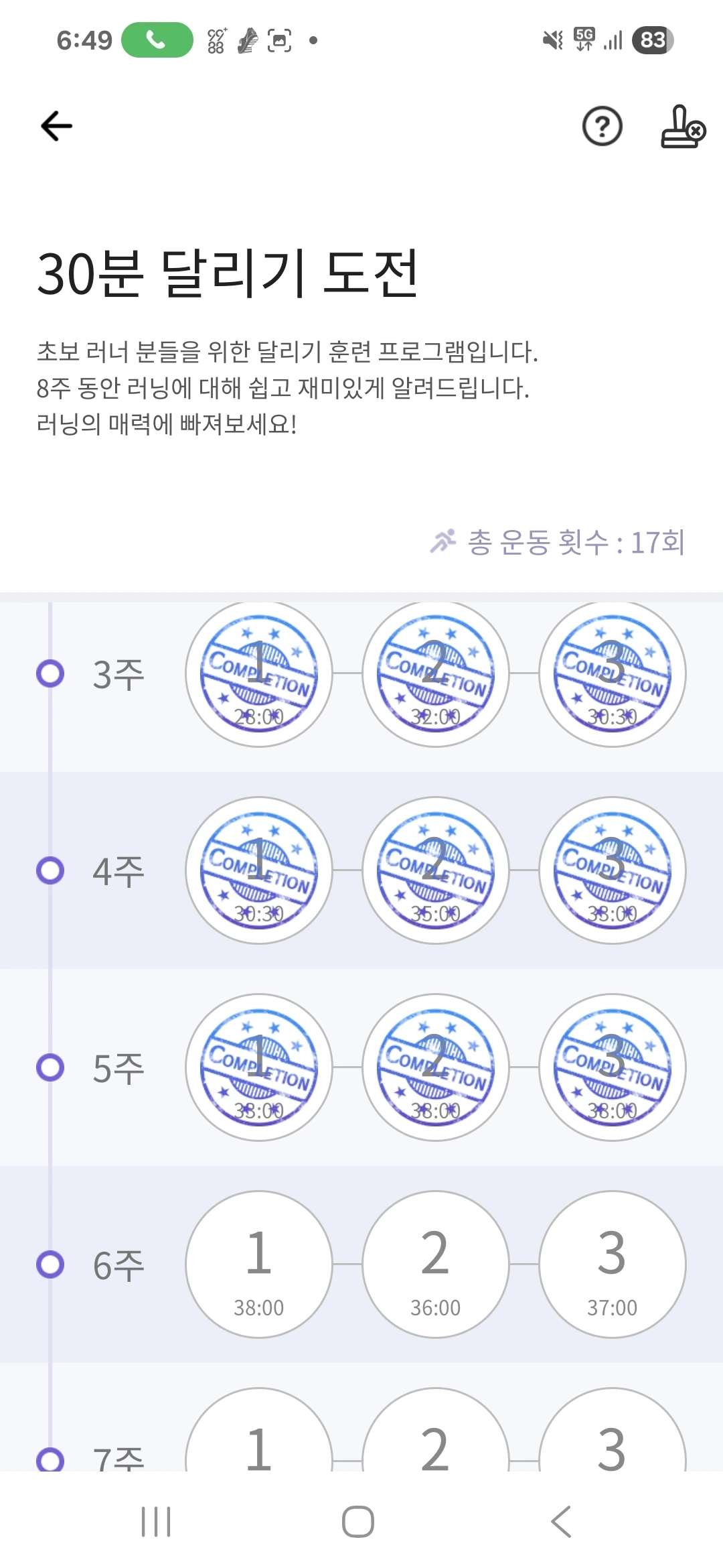 - 아침에 런데이앱 5주 차 3회 차: 4분 뛰고 2분 걷기 6세트 38분 운동완료