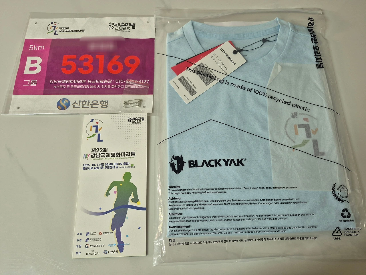택배 비닐에 적힌 주소를 살펴보니 강남국제평화마라톤 사무국에서 온 소포였다. 내게 긴장되고 설레는 마음으로 소포를 조심스레 뜯어보았다. 강남국제평화마라톤 팸플릿과 기념품으로 내가 좋아하는 색상의 하늘색 블랙야크 티셔츠, 내 이름과 번호가 적혀있는 번호표와 기록칩이 있었다. 마라톤 티셔츠, 번호표, 기록칩 등 준비물을 보니 심장이 쿵쾅쿵쾅 나올 정도로 심하게 나댄다.