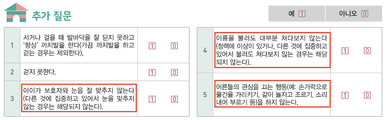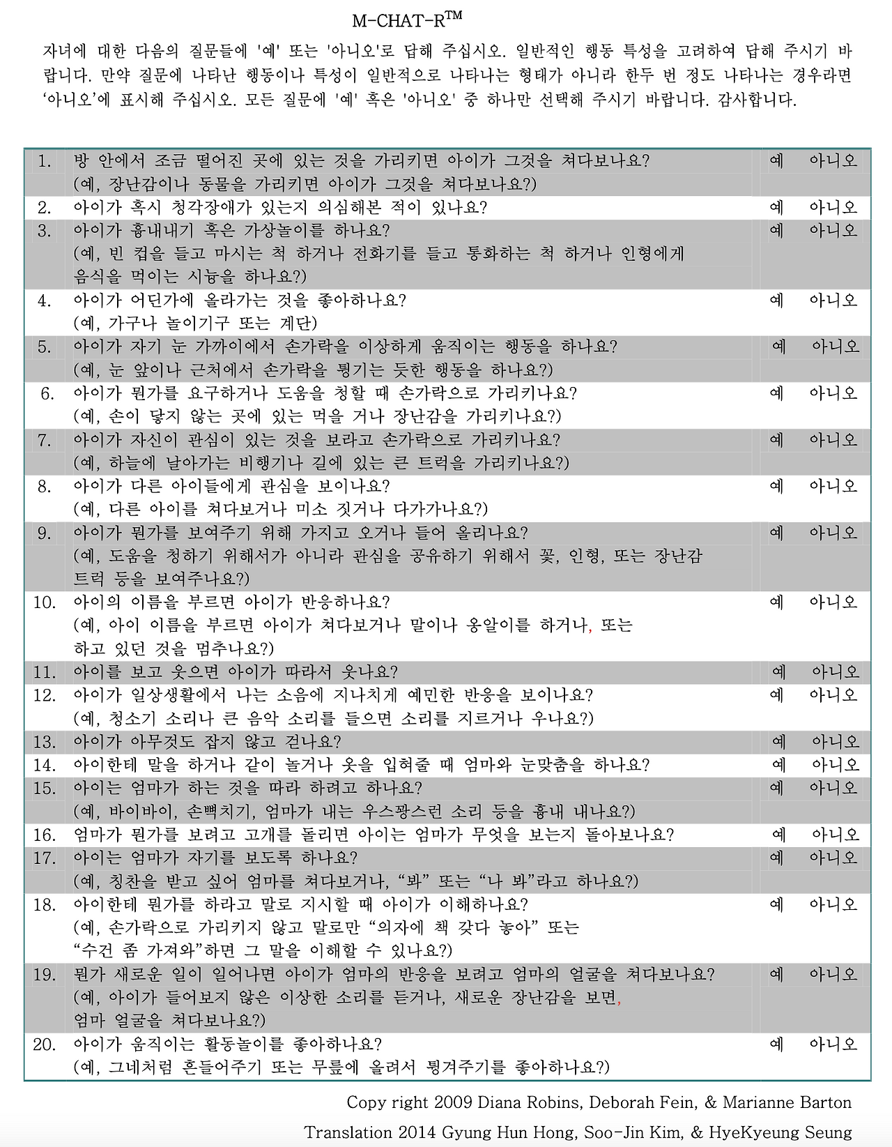 18개월은 처음으로 자폐증에 대한 검사를 하는 시기이기도 합니다. 미국은 아이 100명 중 2명이 자폐스펙트럼 장애가 있다고 하는데요, 그에 비해 한국은 정확한 수치는 없으나 적어도 100명 중 1-2명은 있을 것으로 추정되고, 많게는 4명 까지도 있을 수 있다고 합니다 [2]. 이렇게 흔한 질환이다 보니 미국에선 18개월과 24개월에 모든 소아과 환자들을 대상으로 자폐증 전용 검사도구인 M-CHAT (Modified Checklist for Autism in Toddlers)를 사용합니다. M-CHAT은 20개의 질문으로 구성되어 있는데, 여기서 3개 이상의 대답이 비정상이면 추가 질문을 물어보게 되고, 7개 이상이면 자폐의 가능성이 매우 높다고 판단해 바로 정밀 진단을 위해 의뢰를 하게 됩니다. 반면에 한국은 일반 발달 검사인 K-DST만 4차 영유아건강검진에 사용하는데, 여기서 자폐증에 대한 질문 3개가 포함되어 있습니다.