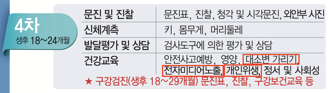 위에 건강교육 항목을 보면 3차 영유아건강검진(9~12개월)과 차이점이 보이는데요, 대소변 가리기, 전자미디어노출, 개인위생 등의 새로운 항목들이 추가가 됐네요. 특히 요즘은 워낙 스마트폰과 태블릿이 대중화되고 아이를 손쉽게 달랠 수 있다 보니 아이들이 전자미디어를 접하는 시간이 많아지고 있어 전자미디어 노출이 중요한 상담 포인트입니다. 다만 생후 18개월보다는 더 일찍 부모와 전자미디어 노출에 대해 상담하는 게 도움이 될 것 같다는 생각이 드네요. 과다한 전자미디어 사용은 아이의 수면시간을 줄이고 비만의 위험률을 높일 뿐만 아니라 아이들의 발달에도 악영향을 끼친다고 하죠. 아이는 사람과 놀이를 통한 상호작용을 하면서 정상적인 발달을 하는데, 화면을 통해 일방적으로 정보만 받게 되면 발달에 악영향을 받기 마련입니다. 그래서 미국소아과학회(AAP)에서는 18개월 이하는 전자미디어에 아예 노출시키지 않을 것을 권장하고, 18-24개월부터는 하루에 최대 한 시간, 그리고 발달을 촉진시키는 선별된 특정 미디어 프로그램 (한국의 EBS와 비슷한 느낌인 PBS라는 공영방송이 있습니다)에 노출시킬 것을 권장합니다 [1].