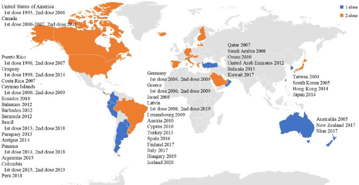 사실 이런 편차는 미국과 한국 사이에만 있는 것이 아닙니다. 위 지도를 보면 미국처럼 2번 맞는 나라(주황색)도 있고, 한국처럼 한번 맞는 나라(파란색)도 있고, 아예 안 맞는 나라(회색)도 있네요. 수두 백신이 개발된 지 30년이 채 되지 않았다 보니 나라마다 예방접종 정책이 많이 다른 편인 것이죠. 이처럼 수두 백신이 널리 사용되지 않는 이유는, 앞서 언급한 무서운 감염병(폴리오, 폐렴구균 등)에 비해 중증도가 떨어져 전 국민을 대상으로 하는 예방접종으로서는 가성비가 다소 떨어지기 때문입니다. 수두 백신이 다른 백신에 비해 비싼 편이기도 한데요, 미국에선 수두 백신이 130 달러인데 비해 홍역과 볼거리, 풍진을 한꺼번에 예방해 주는 MMR 백신은 25달러이라고 합니다 [3]. 또한 각 나라마다 수두에 대한 질병 부담이 다르고, 백신의 가격도 다르기 때문에, 모든 국가가 2회 접종이 필요하다 말하기 어렵습니다 [4].