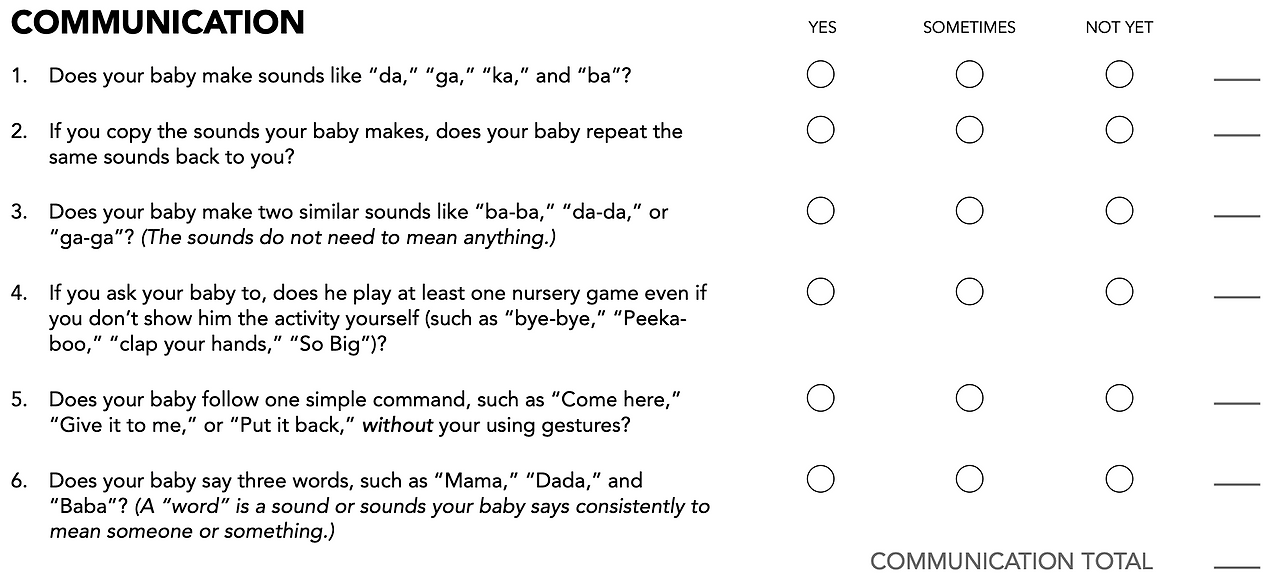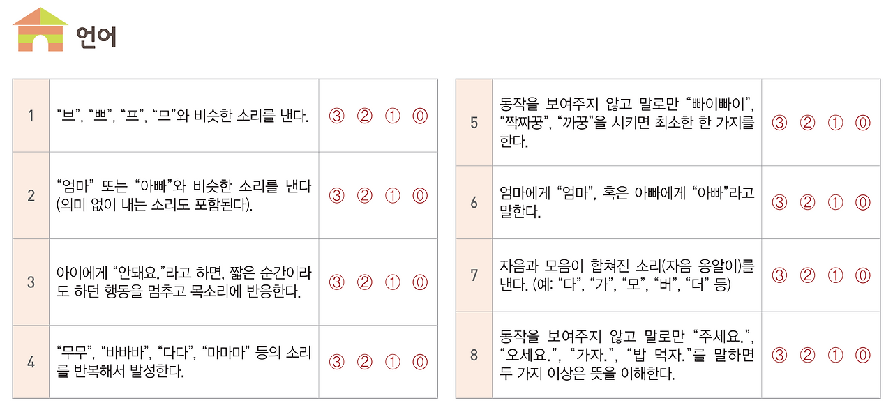 발달평가 도구는 여러 가지가 있으나 미국에서는 ASQ-3 (Ages and Stages Questionnaire 3)라는 도구를 제일 흔하게 사용하고, 저희 병원에서도 이 도구를 사용합니다. 검사도구는 총 5가지 분야, 즉 언어, 대근육운동, 소근육운동, 문제해결 능력, 사회성에 걸쳐 평가를 하는데 9개월에 확인할 제일 중요한 분야는 운동(대근육과 소근육)과 수용언어를 평가하는 것입니다. 또한 9개월은 시력과 청력, 신경운동 장애 (대표적으로 뇌성마비)를 감지하는 적절한 시기이기도 합니다. [1] 한국도 이전에는 ASQ를 변형한 K-ASQ를 사용했으나 한국의 여러 학회들이 모여 독자적으로 K-DST (Korean Development Screening Test for Infants and Children)를 개발해 영유아건강검진에 적용했고, 이 도구가 ASQ보다 발달지연을 더 정확하게 구별한다고 합니다. [2] 아래에 두 검사의 언어 부분만 가지고 와봤습니다. 한국 검사도구가 더 많은 질문을 불어보고, 응답 옵션이 3개가 아닌 4개로 더 많은 것이 특징이네요.