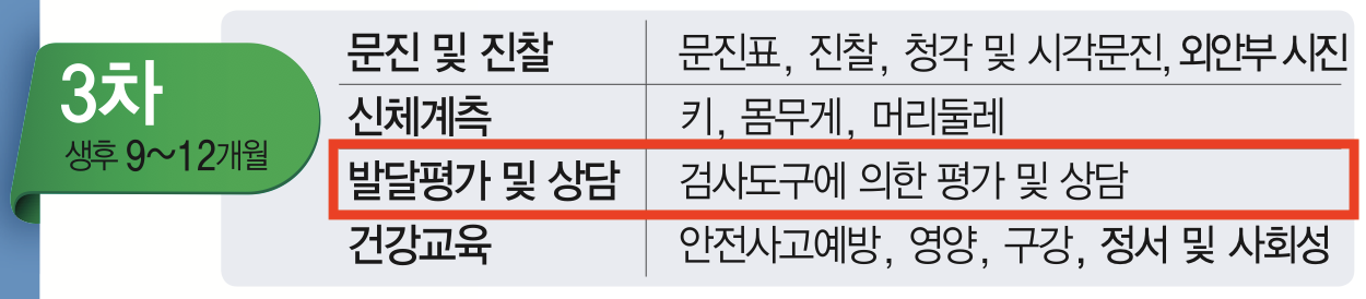 발달 지연을 일찍 발견하고 개입하는 것이 워낙 중요하기 때문에 한국 영유아건강검진에도 발달평가가 포함되어 있습니다. 한국은 3차 검진을 할 때 발달평가를 진행합니다. 미국과 다른 점은 생후 9개월에 딱 맞춰 진행하는 것이 아니라 생후 9-12개월 사이에 부모가 원하는 시기에 진행을 하게 됩니다. 9개월 차는 예방접종이 따로 없고 12개월에 여러 백신을 맞기 때문에, 한꺼번에 다 하려고 생후 12개월에 3차 검진을 하는 부모님들도 계신 것 같습니다. 이렇게 하는 것이 시간 절약은 되겠으나, 만약 발달이 염려가 된다면 9개월에 좀 더 일찍 검진을 받는 것이 좋겠죠?