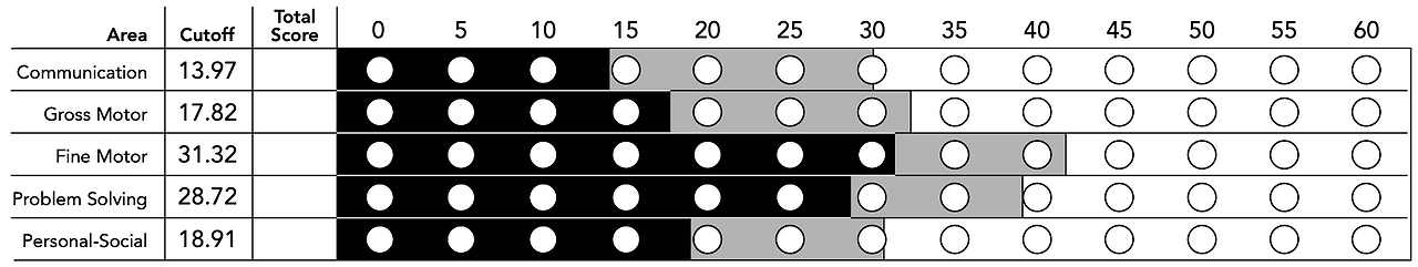 언어를 포함해 총 5가지 영역에 대한 질문을 답하면 각 영역마다 60점 만점의 점수가 나오게 됩니다. 각 영역마다 합격선이 다른데요, 하얀색은 합격, 회색은 주의, 검은색은 불합격입니다. 여기서 불합격이 나오게 되면, 환자의 지연에 따라서 추가 평가 및 치료를 하게 되는데, 소아과에서 직접 평가 및 치료를 하기보단 주로 소아신경과나 물리치료사 (physical therapist), 작업치료사 (occupational therapist), 언어치료사 (speech language pathologist), 청각학자 (audiologist) 등에게 의뢰를 하게 됩니다.
