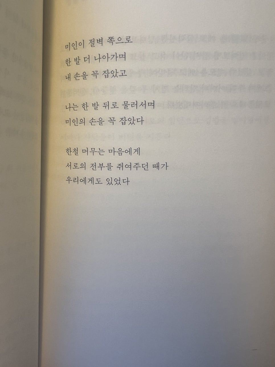 나는 엔딩이 예정되어 있는 이 꿈이 깨어버릴까 무서워 꿈을 놓치고 있어. 자꾸만 내일이 있길 바라게 만드는 너 옆에서. 한편으로는 감히 내일을 함께 하자고 할 수 없게 하는 너의 다짐들이 날 작아지게 해. 움츠러들게 해. 우린 그냥 한여름 밤의 꿈으로 남아야 하는걸까. 그게 더 아름다울까라는 생각도 하게 돼. 이런 생각을 하게 만드는 너가 밉다가도 실없는 농담 한 번에 무슨 고민을 했었는 지도 잊어버려. 참 나쁘다 너. 너의 진심이 궁금해. 나랑 같은 마음이었음 하는 조급함에 말보다 눈물이 마중나가. 너는 퇴근하면 치킨을 사오는 참 따뜻한 사람인데. 내가 별 보고 싶다 그러면 기어이 먼저 나가자 하는 사람인데. 우리 스스로를 자책하지 말자. 눈 앞에 닥친 작은 상처에 내가 너에게 받은 예쁜 감정들까지 무시하진 말아줘.