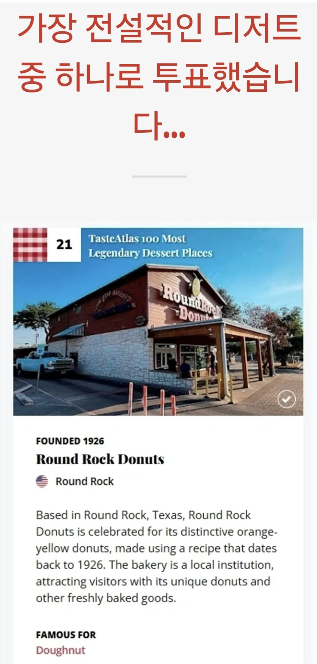 이곳은 2015년에 설립된 유명요리사이트이자 글로벌 미식가이드 Taste Atlas 가 세상에서 가장 전설적인 디저트로 소개했고 Yelp(글로벌 종합 리뷰 플랫폼)가 2022년 텍사스에서 제일 맛있는 도넛 1위로 선정했던 ROUND ROCK DOUNUTS 다.