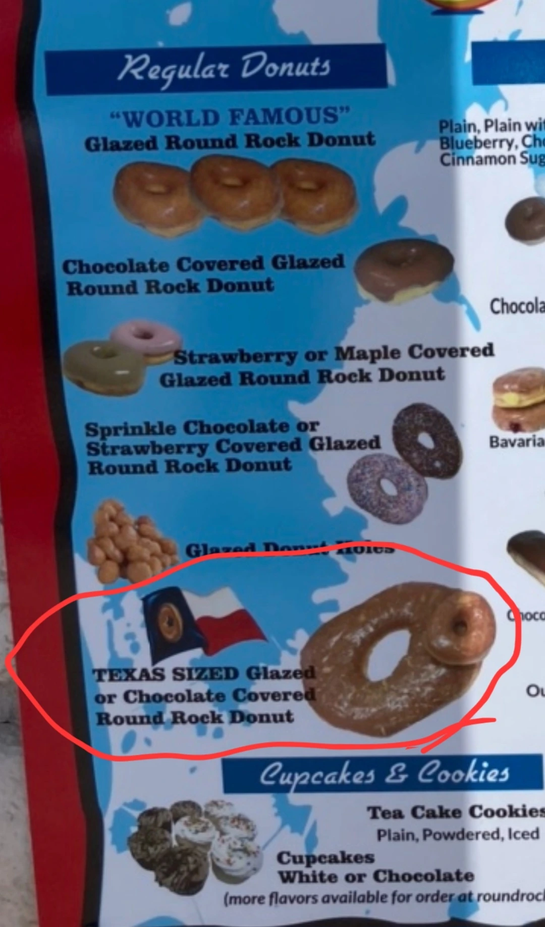 게다가 이곳의 명물 중 하나인 텍사스 사이즈 도넛(Texas -Sized Donut)은 지름이 약 14인치( 35cm 이상)로 도넛하나가 케이크만 해서 보통 파티용으로 주문하는 경우가 많다고 한다.
