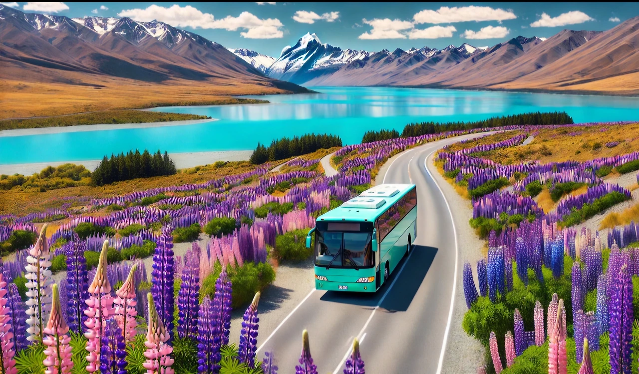 테카포 호수와 야생화 루핀이 펼쳐진 푸른 초원 위로