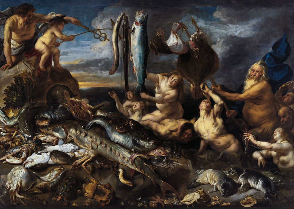 <바다의 선물>은 인간이 바다로부터 얻을 수 있는 것을 그려낸다. 대각선 구도 덕분에 물고기들이 차곡차곡 쌓인 느낌이 들어 풍요가 강조된다. 물고기의 비늘이나 눈알의 빛깔, 꼬리의 결, 거북이 등껍질의 올록볼록함, 소라의 표면 등이 자세하게 묘사되어 있다. 벽 하나를 차지할 정도로 거대한 그림인데도 세부적인 것 하나 하나에까지 공을 들였다. 때문에 집중력이 분산되기는 하지만 찬찬히 감상하는 재미가 있다.