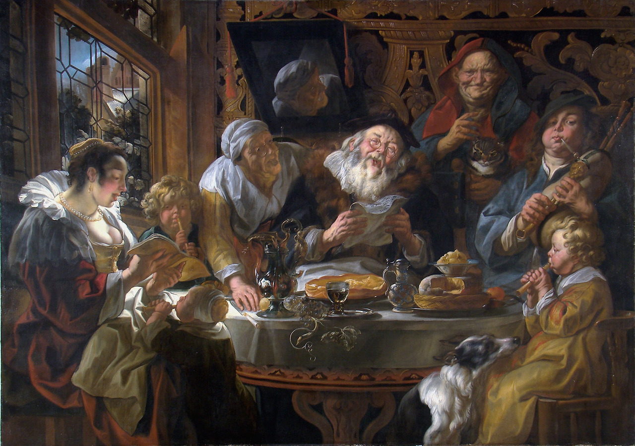 식탁을 둘러싸고 모두가 음악을 즐긴다. 어린 아이들은 저마다 볼을 실컷 부풀리며 악기를 연주하고, 어른들은 그에 맞춰서 노래를 부른다. 밝고 힘찬 가락이 들려오는 듯하다. 간식과 식기의 묘사는 그림에 생기를 더한다. 식탁 오른 편의 치즈는 두툼한 몸에 노란 속살, 흰색과 청회색이 섞인 표면으로 눈길을 사로잡는다. 부드러우면서도 느끼한, 하지만 빼놓을 수 없는 치즈의 맛이 입안에서 느껴지는 것만 같다. 은색의 식기는 사람들을 반사하면서 빛나고 포도는 탐스럽게 투명하다.