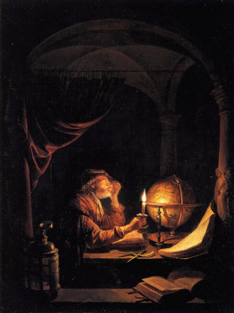 직업이든 취미이든 무언가에 완전히 빠져들면 시간을 의식하지 않게 된다. 이렇게 누군가가 일에 열중하는 모습은 아름답다. 아름다움이란 시간을 정지시키는, 혹은 시간을 초월하는 감정이다. 작품 속의 천문학자는 늦은 시각에도 촛불을 켜고 지구본을 관찰하고 있다. 밤에 맞서서 학구열을 불태우는 그는, 무시간적인 경험을 체화한 아름다운 사람이다.