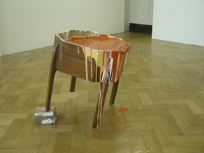 ⓒKevin Hunt, <Table Painting>, 2005. 역시 매체에 'House furniture'라고 쓰여 있다. 책상의 구조가 구현되어 있기 때문에 여전히 가구이긴 한 것이다. 하단의 벽돌로 인해 심히 기울어져 있어 안정적이라고는 할 수 없지만, 애초에 책상 자체가 그렇게 디자인된 것이 아니라 환경에 의해 다리들의 위치가 바뀐 것이므로 '기운 책상'이지 책상이 아닌 것은 아니다.