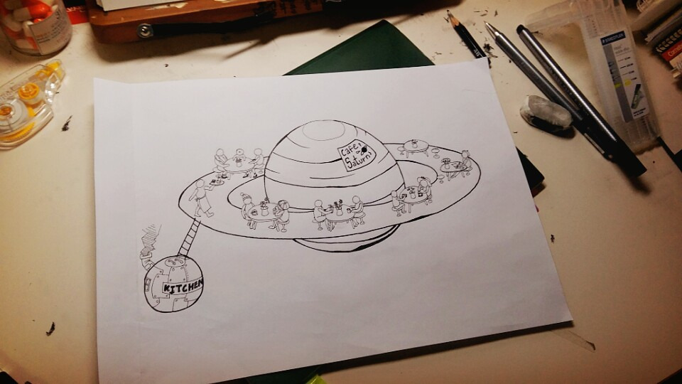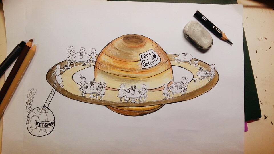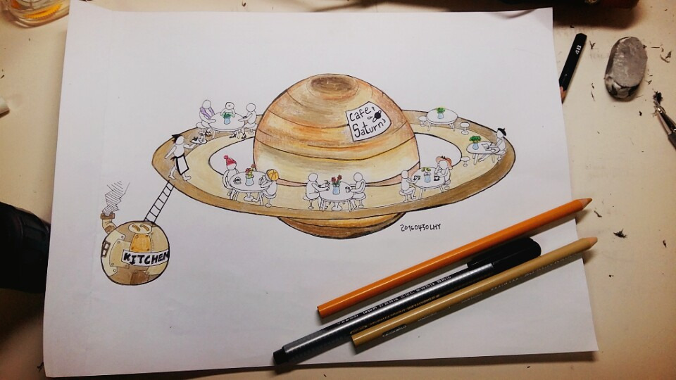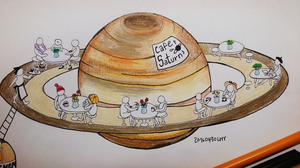 DDP에서 열리는 g서울 아트페어에 다녀왔다. 많은 그림들이 인상적이었지만, 그 중에서도 '강민수'라는 작가의 'Shower(2016)'란 작품이 마음에 쏙 들었다. 식물원 같은 공간에서 인물이 몸을 씻는 그림이었는데 나무들과 샤워기가 함께 있다는 것만으로도 특별했다. 기차가 벽난로를 뚫고 나오는 마그리트의 그림을 본 느낌이었달까. 페어를 다 관람하고 차를 한 잔 마시면서 나 또한 그런 창의적인 공간을 만들고 싶어졌다. 그렇게 문득 떠오른 것이 토성의 카페이다. 토성의 고리 위에 앉아 커피 한 잔 한다면 더할 나위 없이 예술적일 것 같다.
