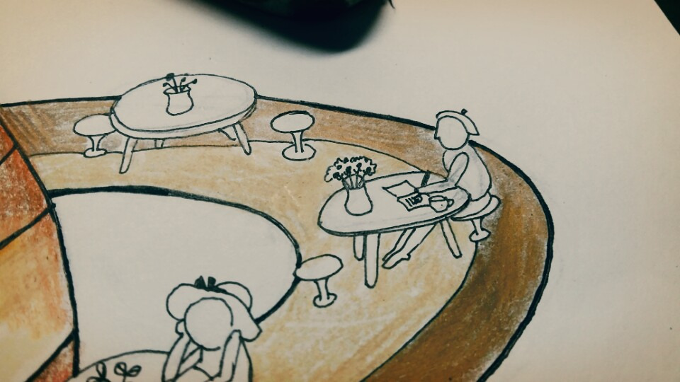 색칠 완성! 사람과 탁자, 의자는 칠하지 않기로 했다. 어깨가 아파오기도 했고, 너무 꽉 채워버리면 답답할 것 같았다. (대충 그린 티가 나는 건 어쩔 수 없다.)