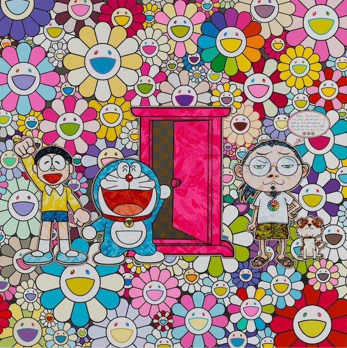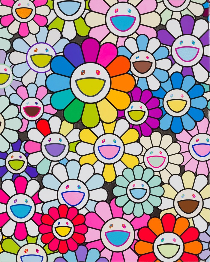 무라카미 다카시의 작품은 아이 같은 감성으로 그려낸 화려한 색깔의 꽃들과 만화에 등장하는 귀여운 캐릭터들이 주를 이룬다.