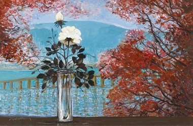 그러나 미셀 앙리의 도자기나 유리병에 꽂힌 꽃 그림의 배경은 풍경을 그려 넣었다.