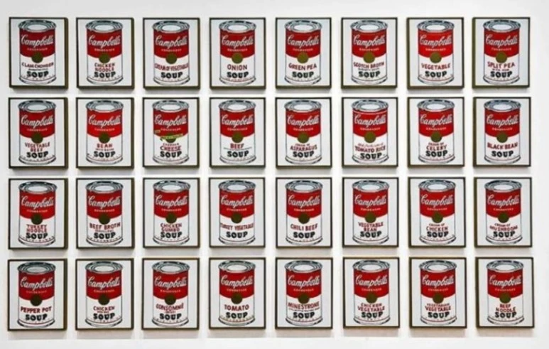 1962년, 앤디 워홀은 캠벨 수프의 캔(통조림) 32개를 4층으로 가지런히 줄 맞춰 나열한 그림을 그렸다. 처음 작품은 합성 페인트로 그렸으나 나중에는 실크스크린으로 제작했으며 연작으로 선보였다. 같은 시기에 소비문화를 대표하는 아이콘인 코카콜라 병들을 소재로 한 실크스크린 작품 역시 시리즈로 제작되었다. 이 작품들의 성공으로 그는 대중 매체로부터 각광을 받았고 부를 거머쥐게 된다.