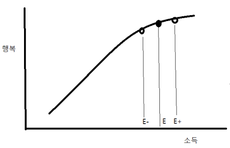 돈이 비타민이 되는 지점을 충분 소득 (E) 이라 하자. 이렇게 생각해보면 될 것이다. 충분 소득보다 작은 소득 (E-) 의 경우 나는 이렇게 생각하고 있을 것이다.