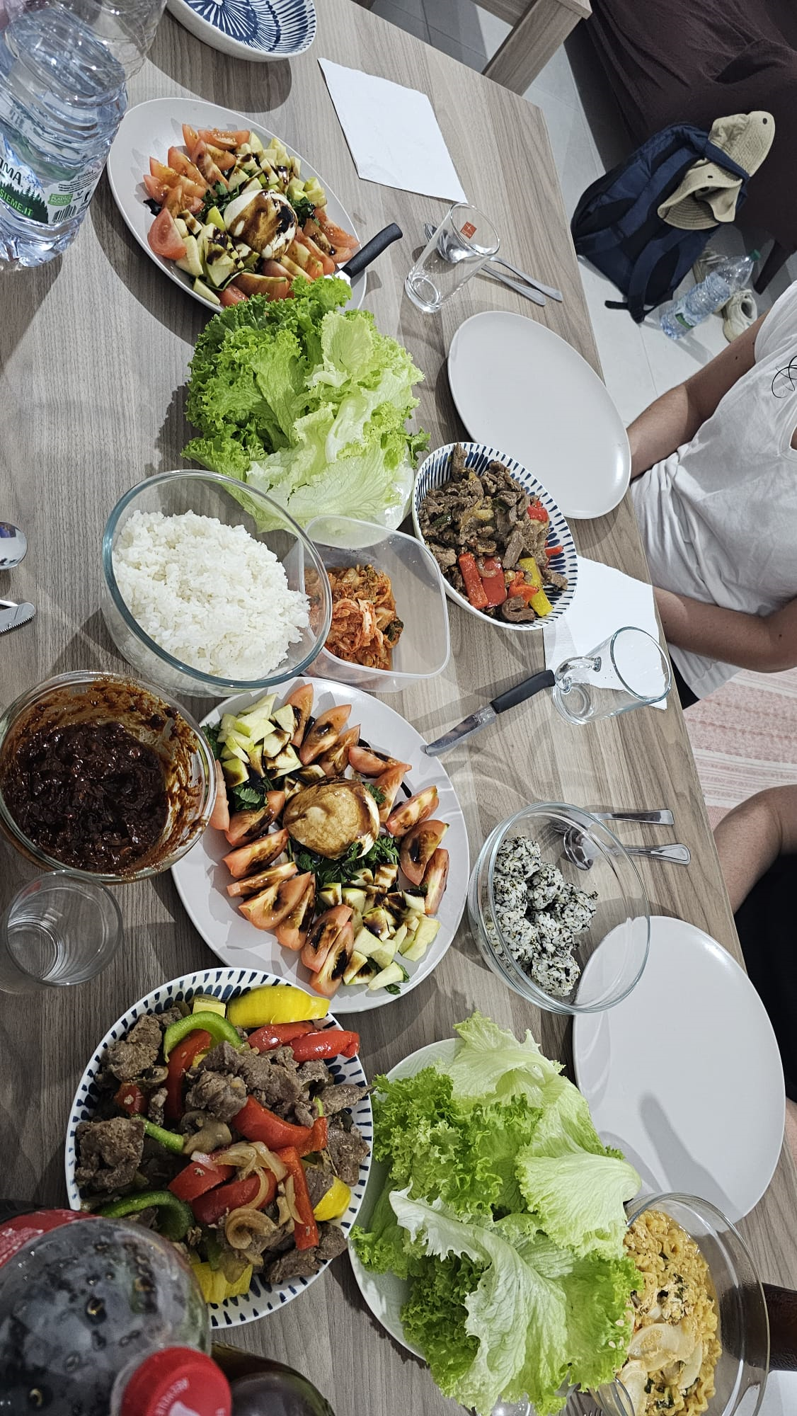 내가 직접 쌈을 싸서 보여주자 콜롬비아 친구인 알레하가 쌈을 만들어 반으로 나누려 하길래, 쌈은 한입에 먹는 것이라고 알려주며 작게 싸는 방법도 함께 설명했다. 식사 중에는 미리 준비한 와인을 곁들였고, 같이한 친구들 모두가 예의상으로 하는 말이 아니라 정말 맛있다고 말해주어 마음이 놓였다. 매운 음식을 좋아한다는 피우스는 오늘 메뉴가 맵지 않아 아쉽다며 웃었고, 나는 나중에 더 매운 한국 음식을 만들어 주겠다고 약속했다.
