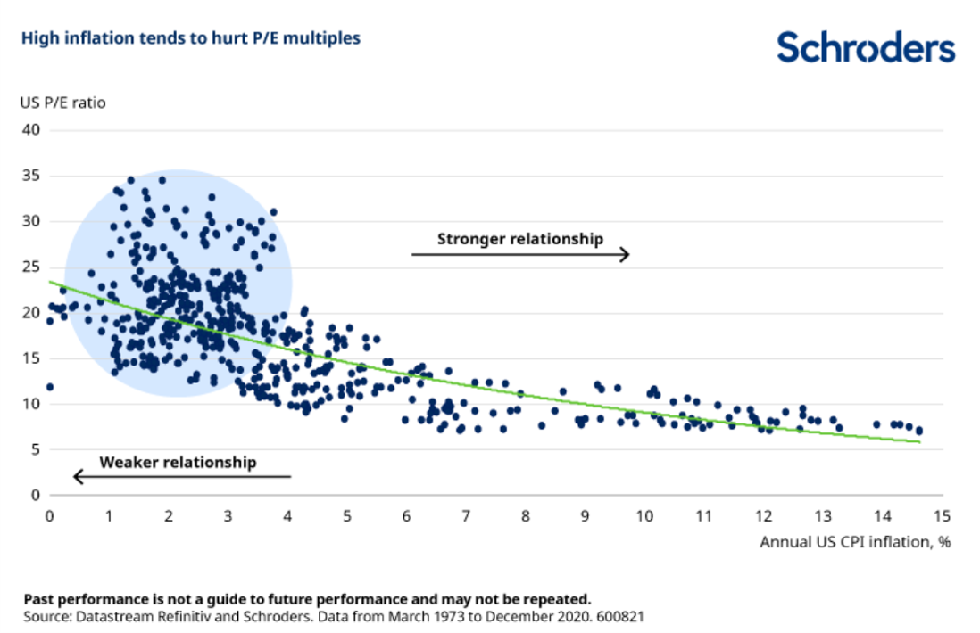 인플레이션이 낮은 구간(<4%)에서는 P/E가 13~35배로 매우 넓게 분포한다.