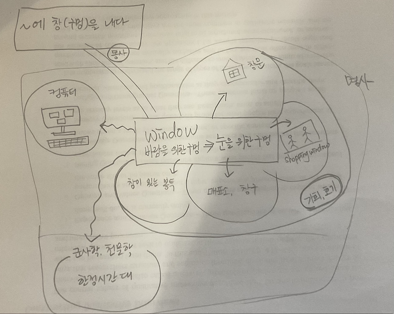 window의 원래 의미에서 파생된 현대의 다양한 의미를 우리는 쉽게 추측할 수 있다. 즉, 우리 사람의 눈을 위해 만든 모든 구멍이나 문은 전부다 window라고 불릴 수 있다는 것이다.