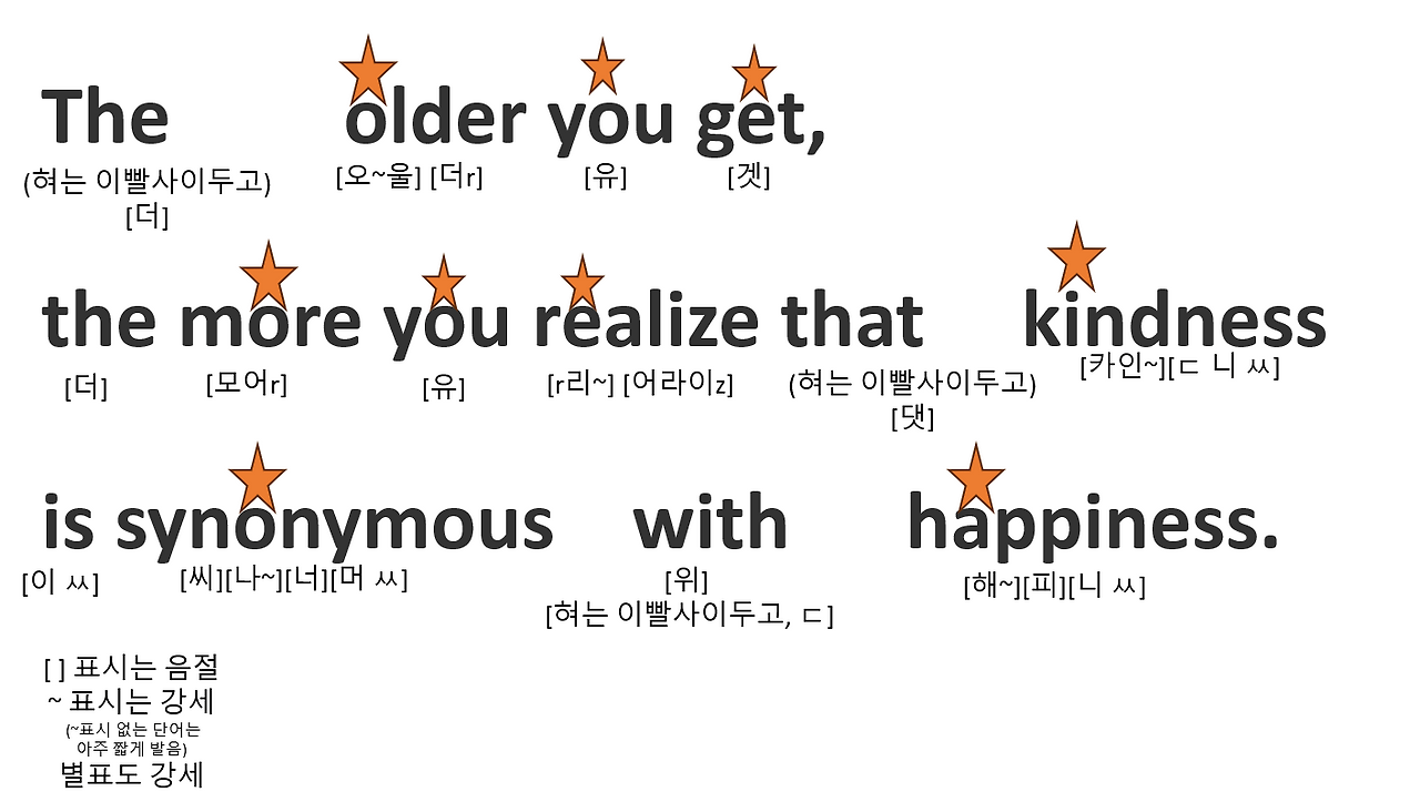 영어강세는 강세가 있는 음절을 길게 발음하고 강세 없는 것은 최대한 짧게 발음하면 강세를 쉽게 넣어줄수 있다. 또한, 항상 기억해야 할것은 자음으로 끝나는 단어에는 절대 '으' 모음을 넣지 않는 것이다. [해~피니ㅆ]는 절대 [해~피니쓰]라고 발음하지 않기!