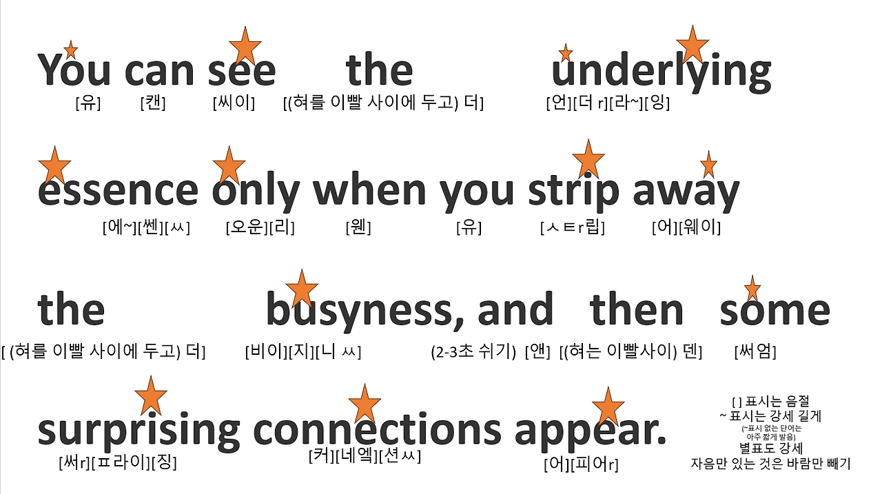 강세가 들어간 음절은 최대한 길게 발음하고 강세가 없는 부분은 짧게 말하면 쉽게 강세를 넣을 수 있다. 단어에 최대한 감정을 싫어 문장을 읽어보자. strip은 1음절 단어이다. [스트립]으로 발음하면 3음절이 된다. ㅅ ㅌ는 '으' 소리를 넣어주지 말고 바람만 뺀다. r은 한글에는 없는 발음이다. L(l) 소리와 한국사람이 가장 많이 헷갈리는 소리이다. 둘다 'ㄹ' 발음에서 시작하지만, 영어 r은 혀가 입 천장을 닿지 않는다. 반면 L은 혀가 천장에 닿아야 한다. r은 굳이 혀를 돌돌말아 굴릴필요는 없다. 혀가 입 안에서 허공을 치고 목 안쪽으로 약간 끌어당기면 충분하다. 또한 r은 '우' 입술 모에서 시작하고, L은 '으' 입술모양에서 시작한다.