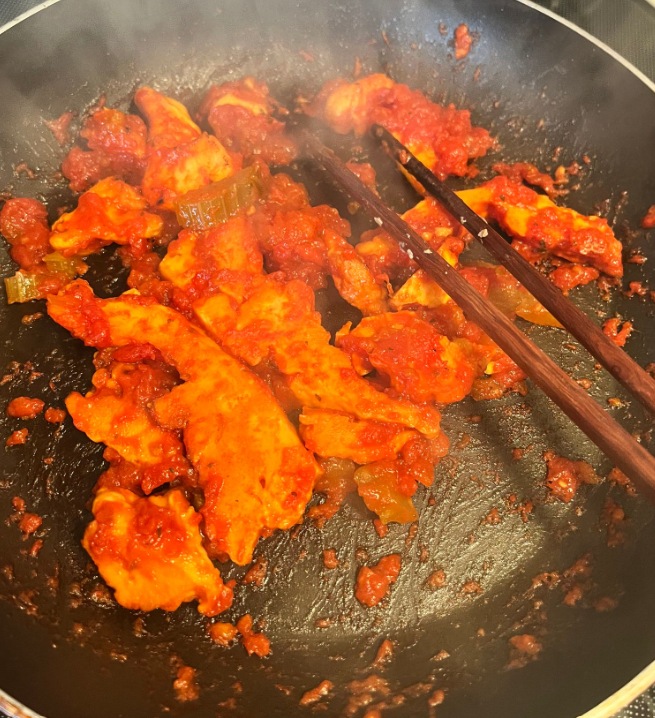 버섯이 어느정도 익었으면 스파게티 소스와 버무린다. 그리고 진짜 치킨도 같이 넣는다. 몇 주 전에 수비드에 삶은 후에 냉동 시킨 닭다리 넓적살이 있었다. 에어프라이기에 냉동된 닭다리 살을 로스팅했다.