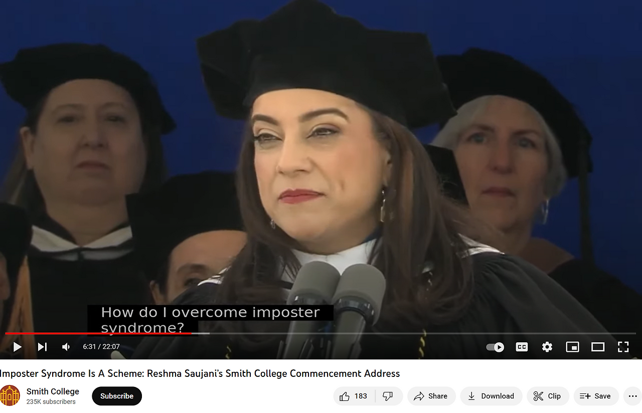 2010년 미국 의회에 출마한 최초의 인도계 미국 여성 레슈마 사우자니는 이 가면증후군에 대해 미국 스미스 대학교 2023년도 졸업식장에서 다음과 같이 연설했다.
