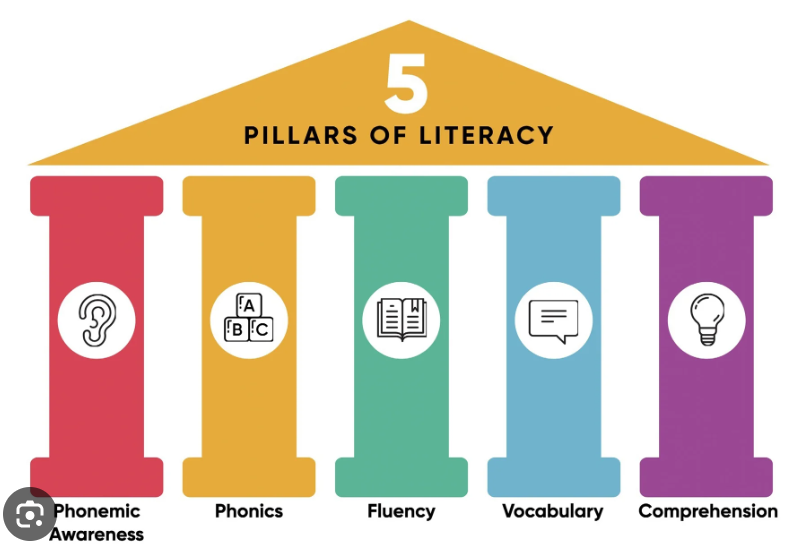 [문해의 5가지 기둥: 음소 인식 (의미차이가 발생하는 소리), 발음(파닉스), 유창성, 어휘, 이해]