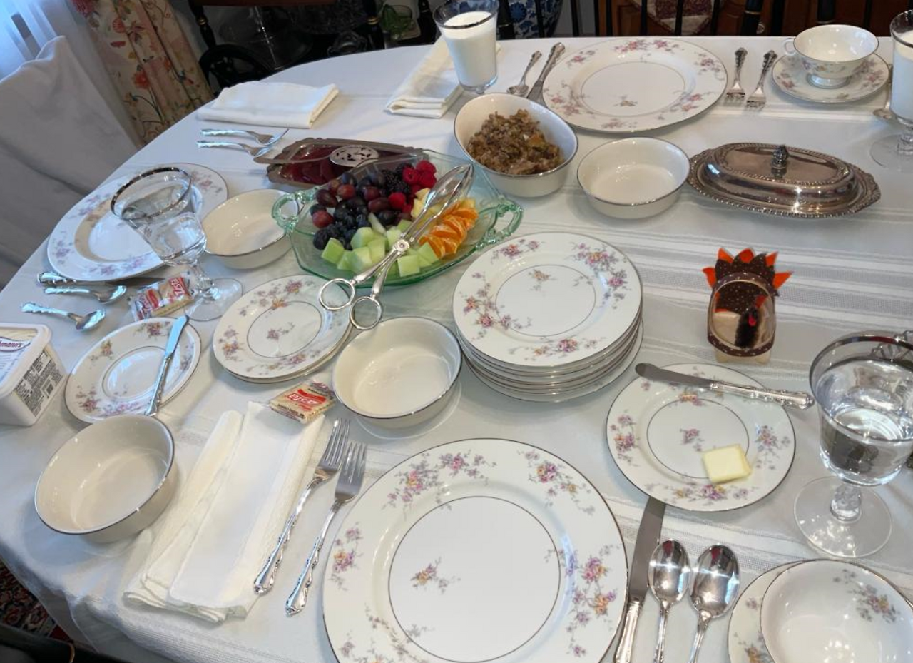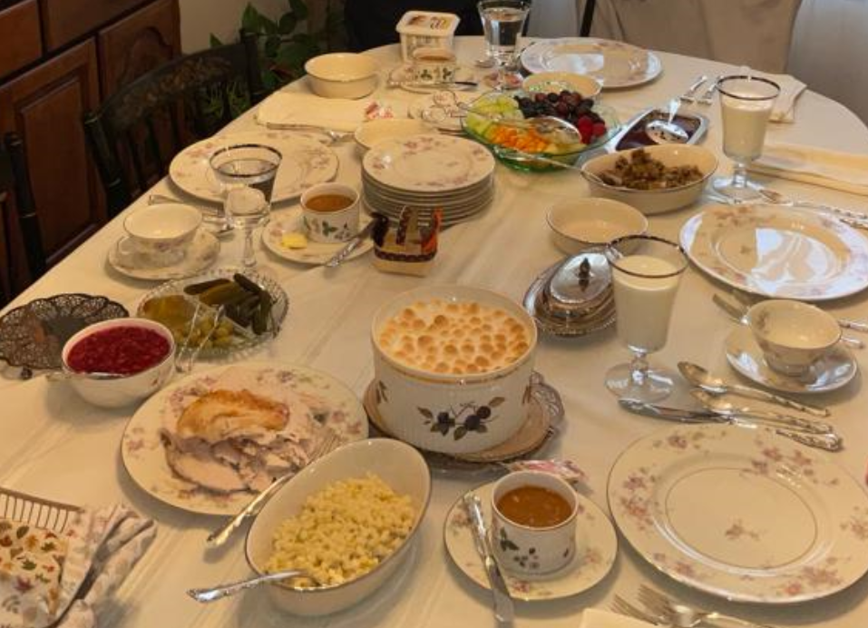 시어머니가 시어머니로부터 받았다는 금 테두리 식기가 별거 아닌 추수감사절 음식을 매우 돋보이게 해 준다.