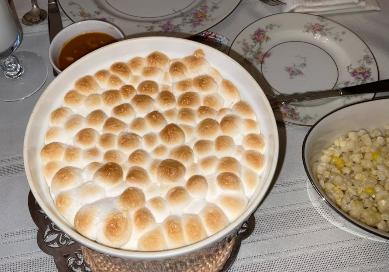 접시에 일단 담아두고, 다른 음식을 준비한다. 시어머니가 며칠 전에 삶아둔 고구마를 갈고, 시어머니의 레시피에 따라 다양한 조미료를 넣은 다음 볼에 넣었다. 그 위에는 하얀 마시멜로를 듬뿍 올리고 오븐에 넣는다. 마시멜로가 녹아서 두껍게 갈색 층을 이루면 완성이다. 완성된 음식들은 가족이 함께 먹을 테이블 위에 하나둘 놓아두기 시작했다.
