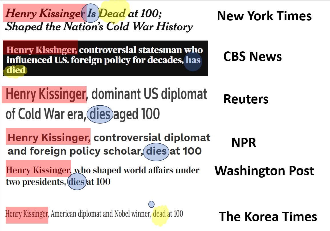 그런데 The Korea Times만 제외하고 모든 기사들의 시제는 '현재'를 사용하고 있다. 이 기사가 나올당시에는 분명 헨리 키신저는 이미 죽었는데 왜 기사들은 died라는 과거시제를 사용하지 않고 현재시제를 사용한 걸까?