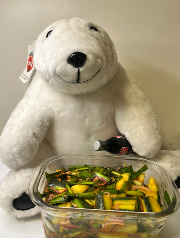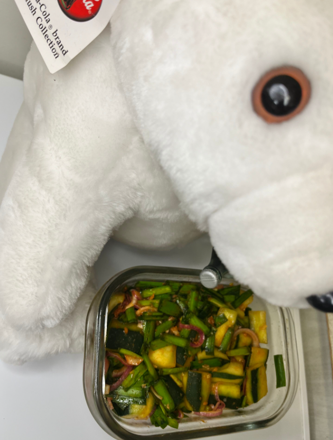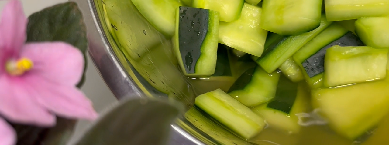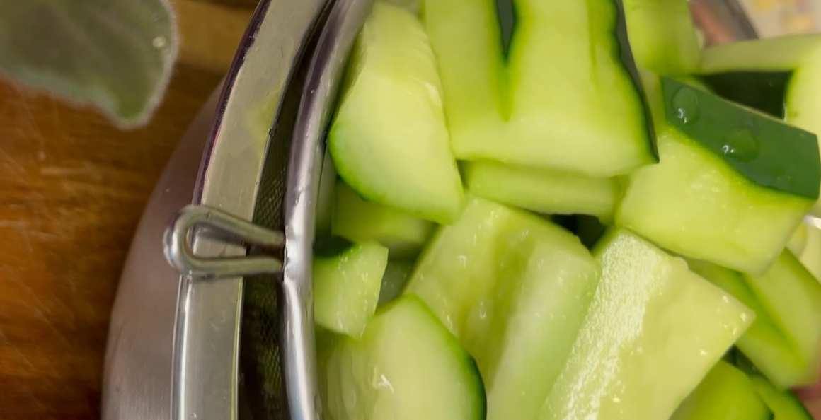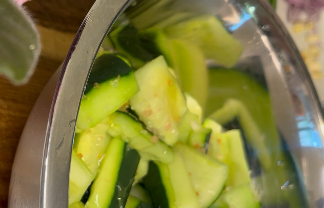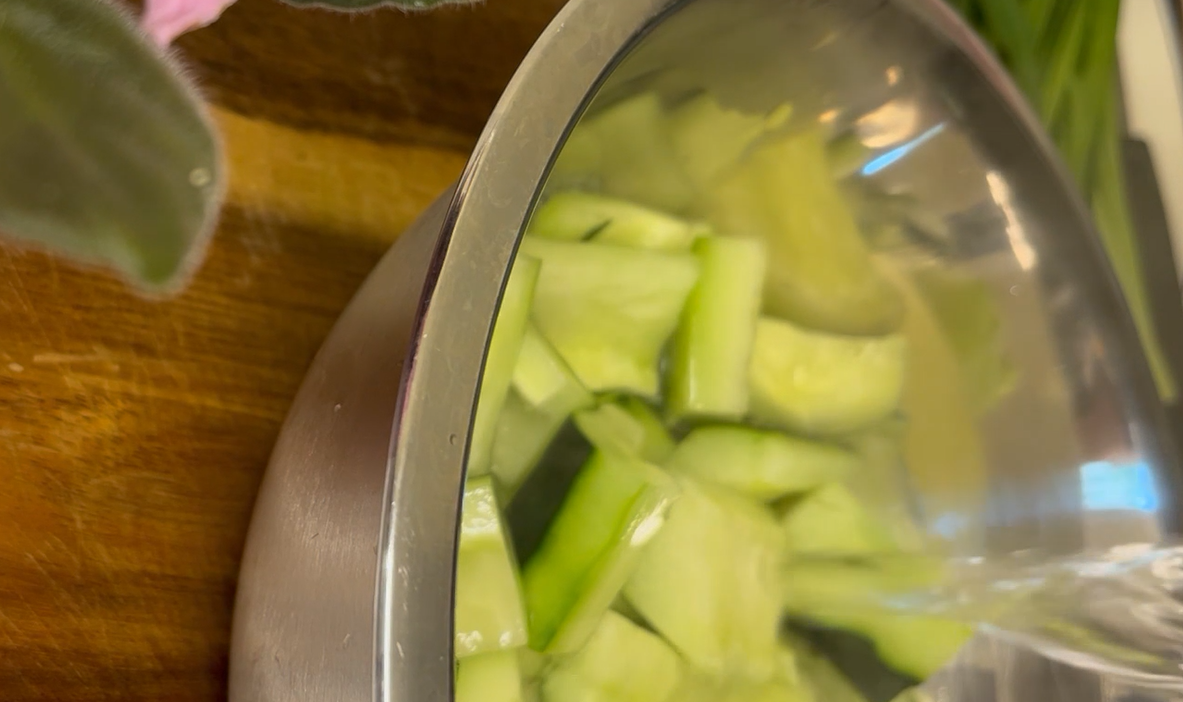 20분 후면 오이에서 물이 저렇게나 많이 나온다. 찬물에 두 번 잘 씻어서 물을 잘 빼준다.