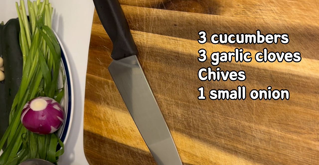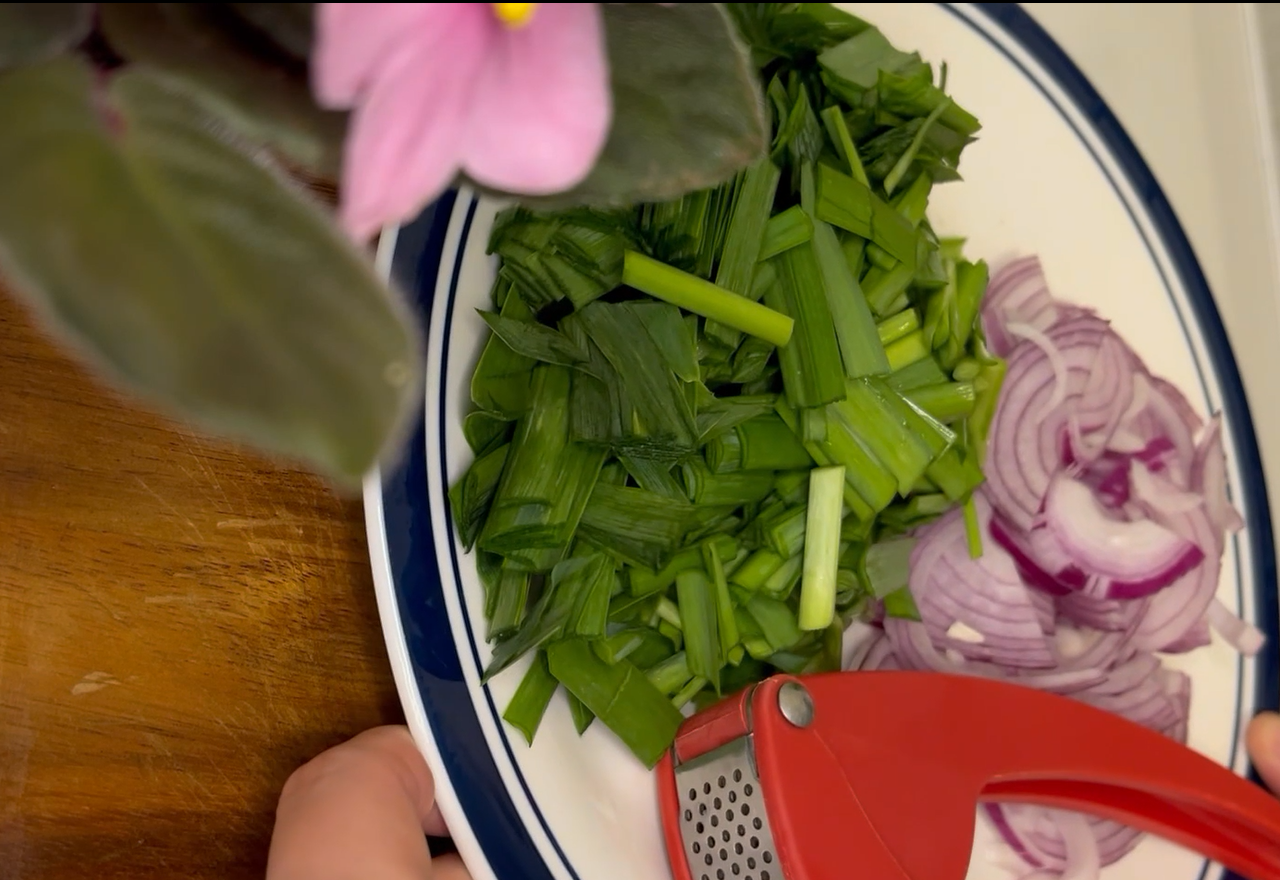 부추는 오이보다 약간 더 작은 크기로 썬다. 마늘은 작게 잘라서 마늘 압축기에 넣어서 준비해 둔다.