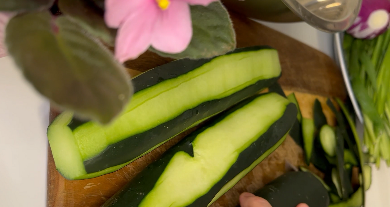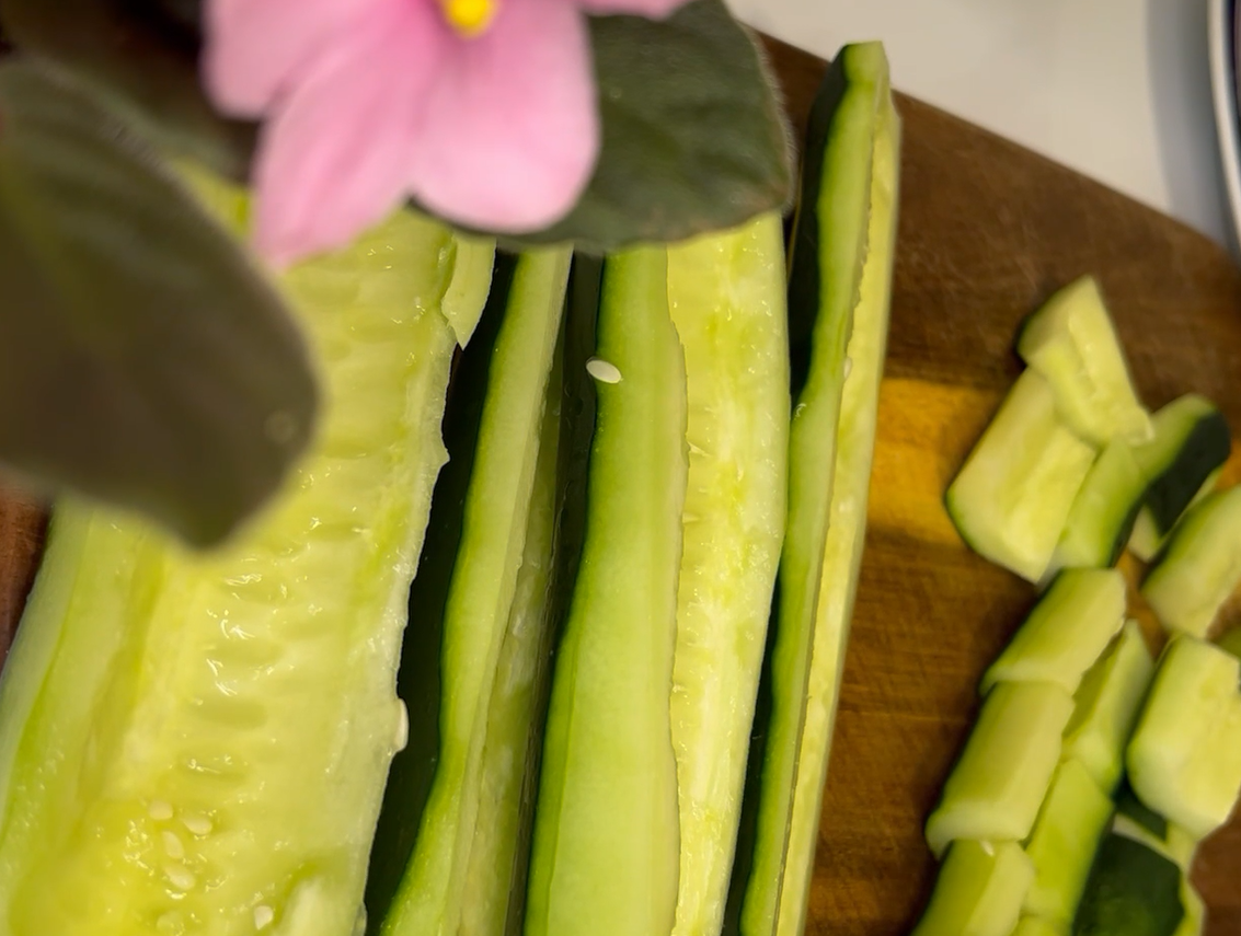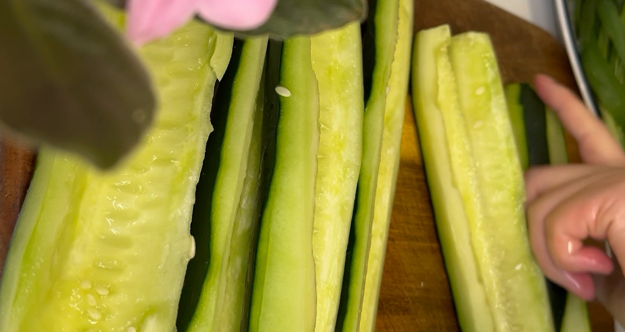 씨를 다 제거한 다음 오이를 또 절반으로 길게 자르고 먹기 좋은 크기로 자른다.