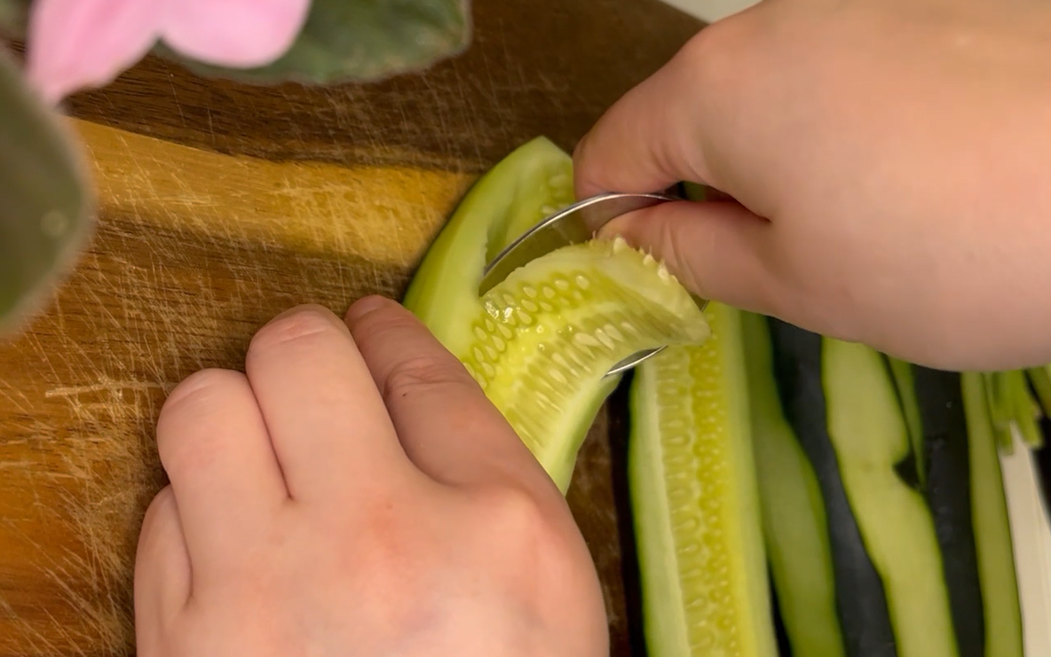 오이를 길게 절반으로 자른 다음 수저를 이용해 씨를 제거한다.