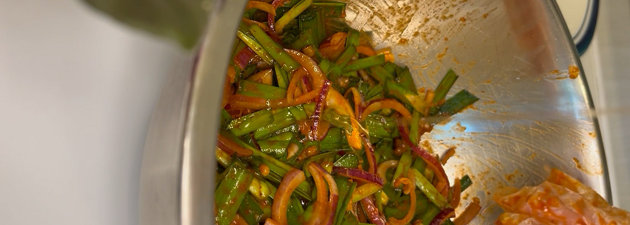 이 양념에 썰어둔 양파와 부추를 넣고 잘 버무린다.