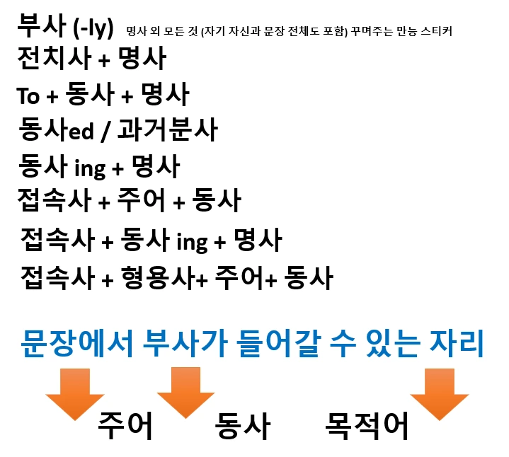 위 그림에서 부사가 될 수 있는 단어 무리들이 아마 친숙해 보일 것이다.