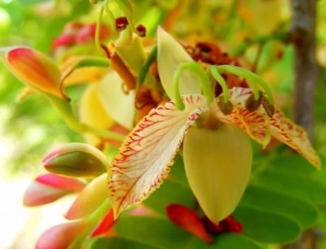 꽃은 5월 상순에서 9월 중순에 피는데, 총상 꽃차례에 5∼12개의 꽃이 달리며 노란색 바탕에 자줏빛이 섞인 붉은 줄이 있고 뒷면은 흰색이다. 꽃잎은 5개 중에서 2개가 퇴화한다. 열매는 길이 약 20cm, 나비 약 2.5cm이고 외과 피는 얇다. 중과피는 끈적임이 있고 두꺼우며 짙은 갈색이고 납작한 종자가 들어 있다.