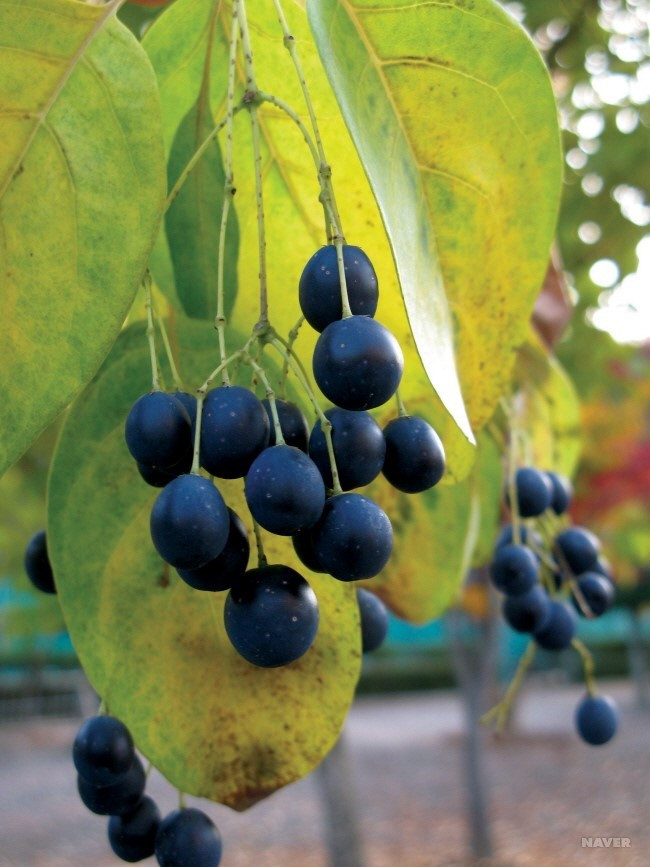 열매는 타원형으로 검은 보라색을 띠며 10∼11월에 익는다.
