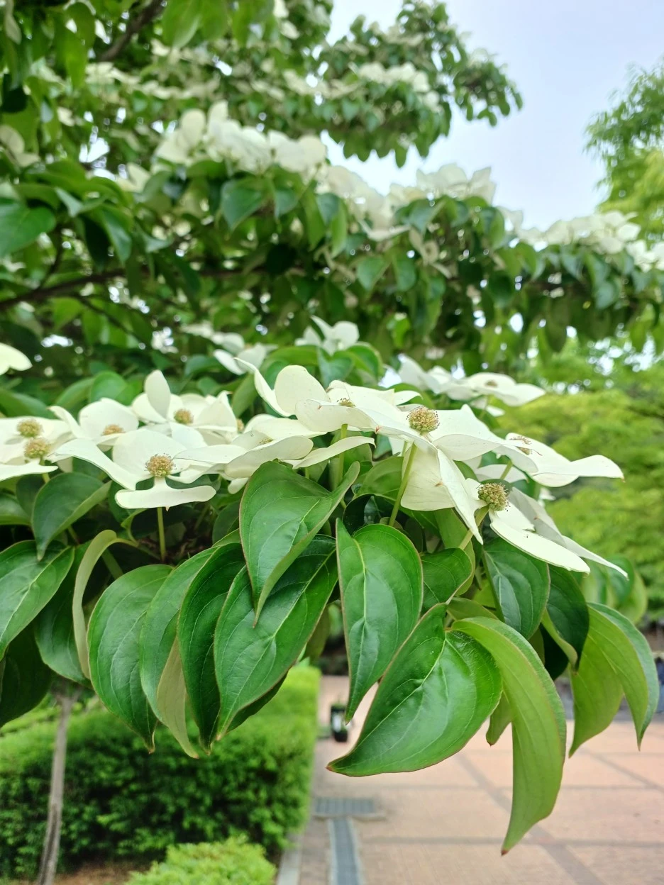 갈산공원 분수 정원 앞 산딸나무에는 흰나비 떼가 노니는 듯 온통 새하얗다.