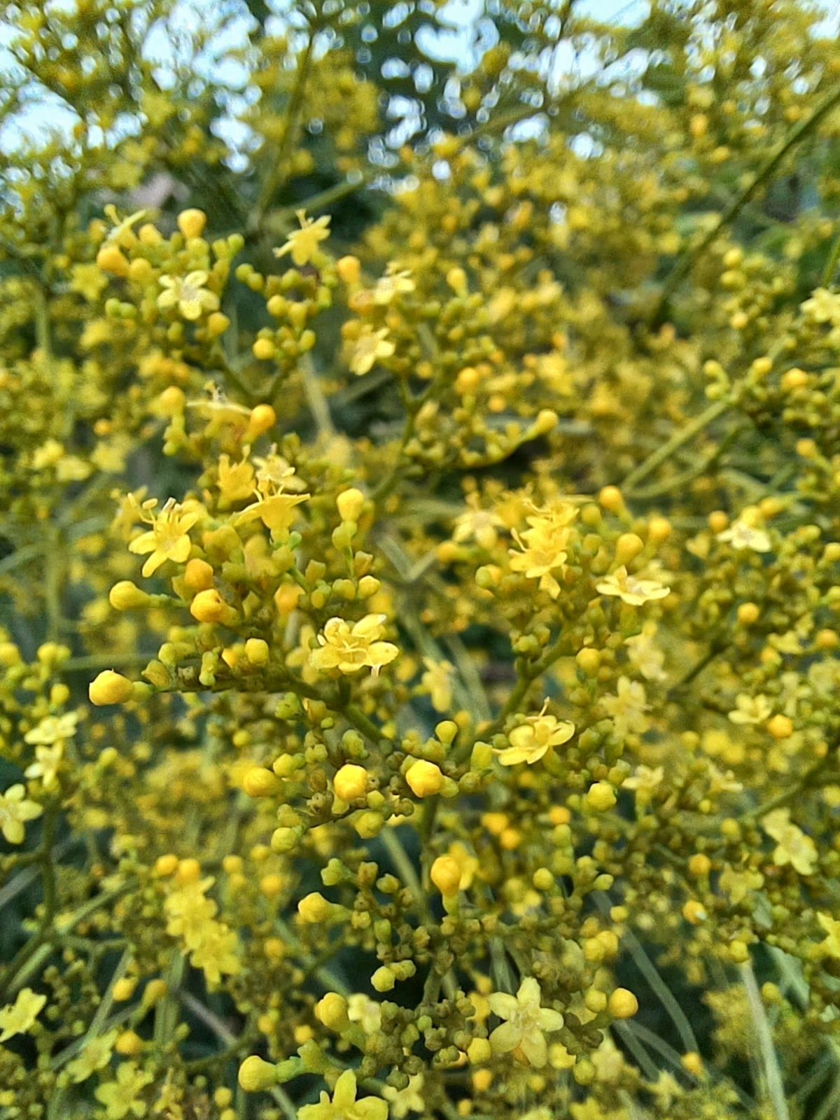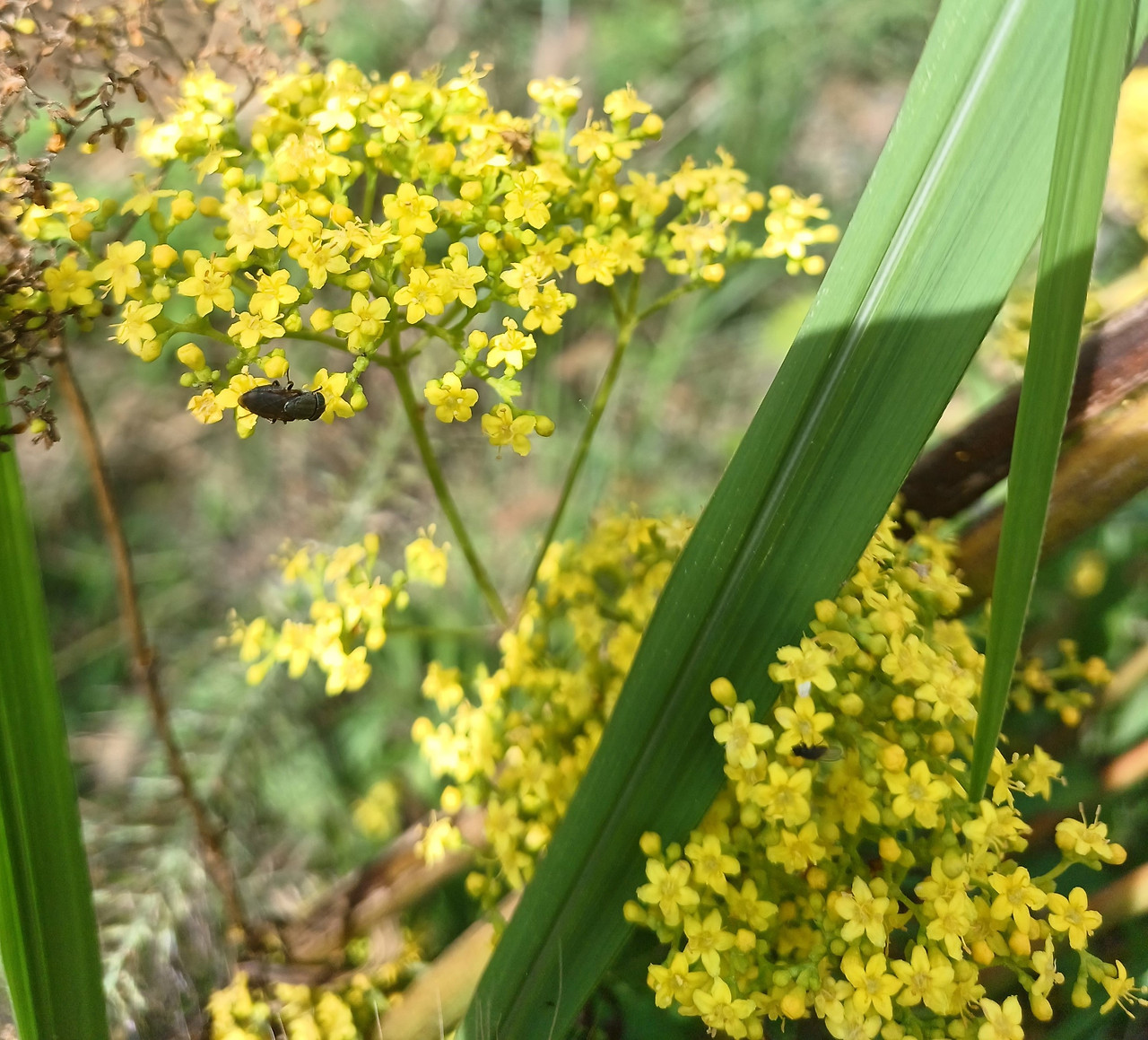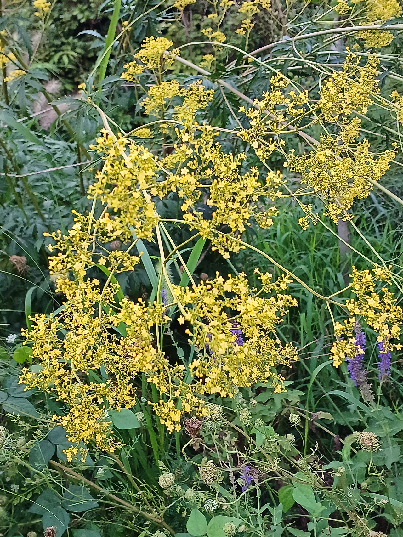 바람에 흔들리는 꽃송이들이 마치 작은 우산을 펼쳐 든 듯한 모습에 호기심이 일었다. 내려서 보니 60~150cm에 이르는 긴 줄기 위로 수십 개의 노란꽃이 산방꽃차례로 피어 있었다.