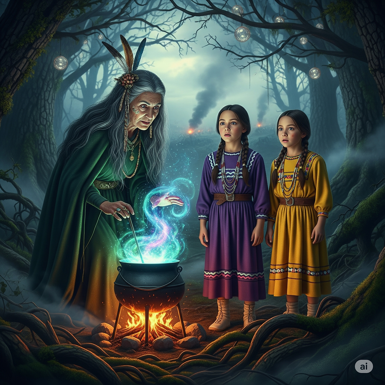전쟁이 시작되자, 두 자매는 깊은 숲으로 피신했고, 그곳에서 마법을 쓰는 한 노파를 만났다.