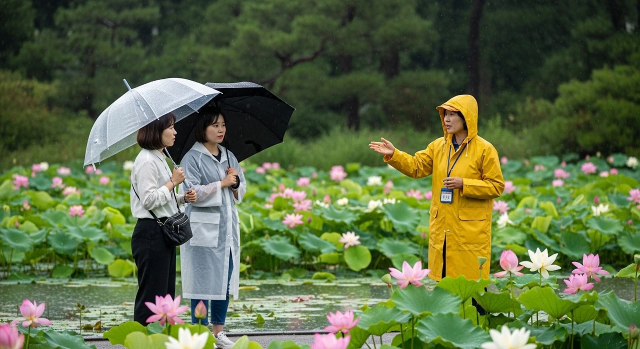 비에 젖은 수목원을 천천히 거닐며, 연못 위에 피어 있는 연꽃을 바라보고,