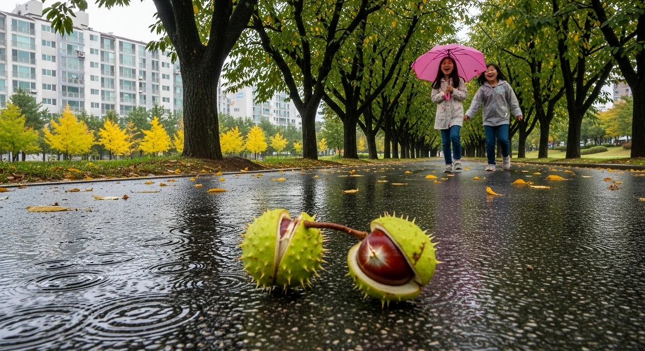 비가 촉촉이 내리던 늦가을, 목동아파트의 중앙 산책로는 젖은 낙엽과 함께 반짝이는 열매들로 물들어 있었다.